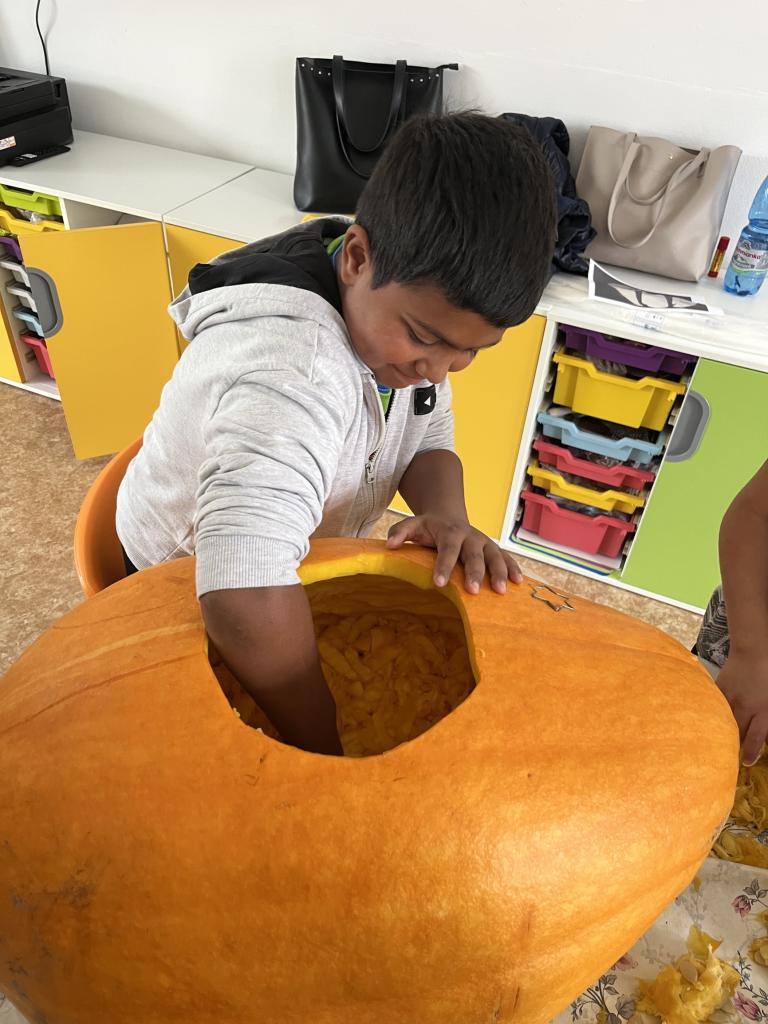 V naší školní družině jsme se pustili do tradiční podzimní zábavy – dlabání dýní. Nejprve jsme opatrně vyřízli vršek dýně a vydlabali dužinu. Potom přišla na řadu zábavná část – pomocí vykrajovátek jsme do dýně vytvořili různé tvary, například ježky, hříbky, kočky, hvězdy a mnoho dalších. Nakonec jsme vyřezali i velkou kočku, která se stala hlavní ozdobou celé dýně.