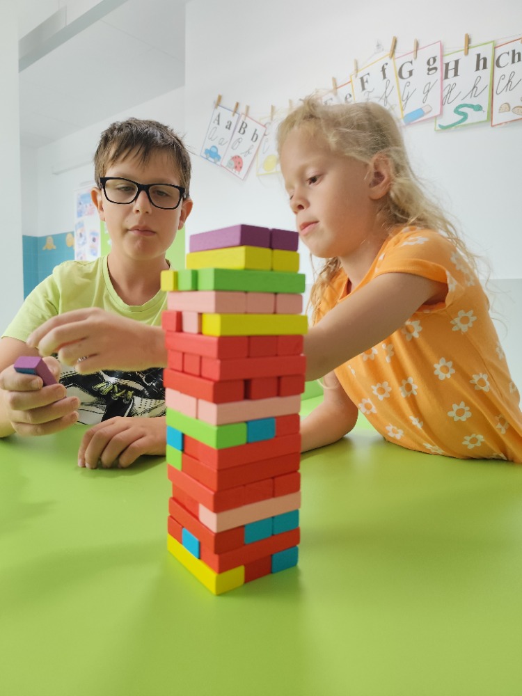 Když nám počasí nepřálo, trávili jsme čas v družině. Děti si rády zahrály deskové hry, které rozvíjejí logické myšlení a spolupráci. Oblíbenou činností bylo také stavění z kostek – vznikaly vysoké věže, města i malé domečky, ke kterým děti vymýšlely vlastní příběhy.