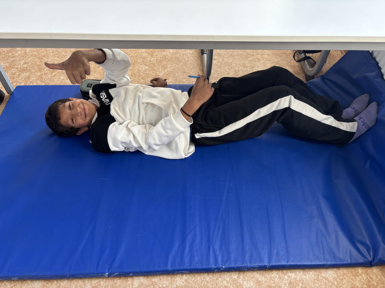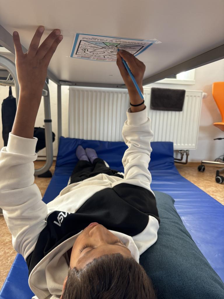 Ve třídě VII. B se učilo trochu jinak – žáci tentokrát pracovali pod stolem! Leželi na žíněnkách a úkoly měli nalepené ze spodní strany stolů.