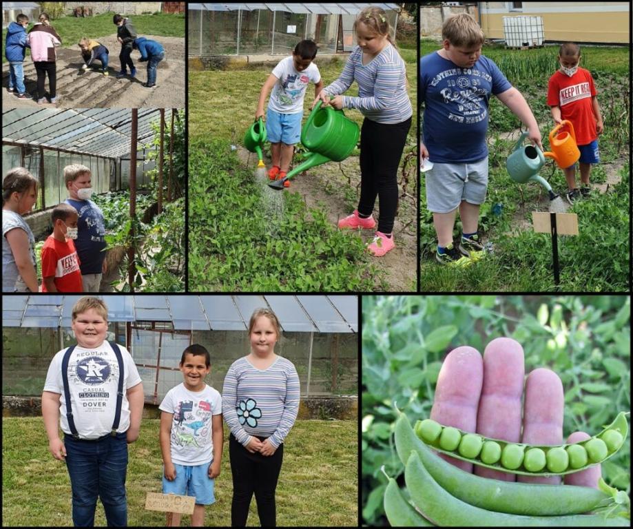 Představujeme paní učitelku Marťu a její partu, která od jara nelenila a hned, jak to počasí dovolilo, vysela do záhonů hrášek, ředkvičky, salát a červenou řepu. Ředkvičky jsme chroupali, hrášek louskali a řepu si na podzim zavaříme.