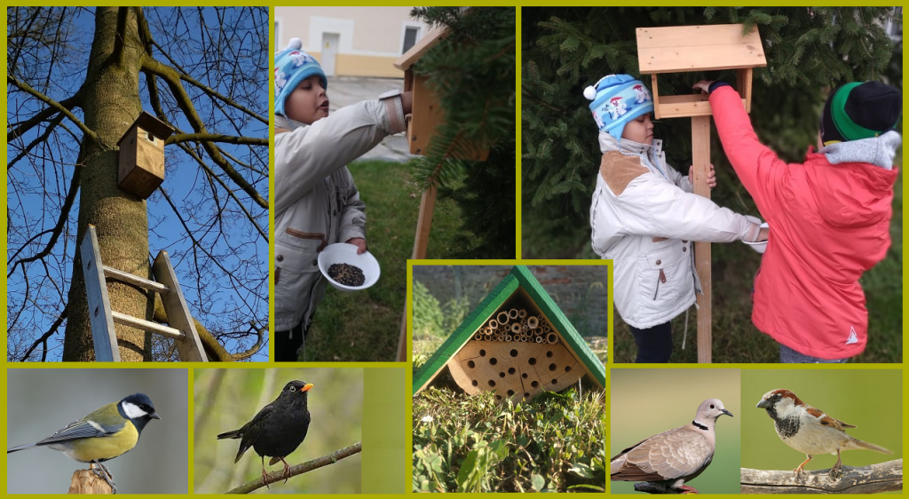 Na zahradě jsme instalovali krmítka a budku pro drobné ptactvo. Ptáky v zimě poctivě přikrmujeme a budku kontrolujeme a čistíme. Na krmítko létali stehlíci, sýkory, hrdličky a vrabci. Taky se staráme o hmyz. Máme hmyzí hotel. Je to sice malý hotýlek, ale brzy ho obydlel čmelák.